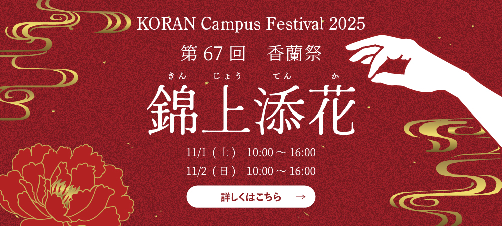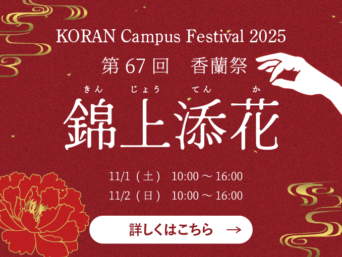 Pick up OPEN CAMPUS 香蘭ってどんな学校?どんな雰囲気?知りたいことが全部わかるオープンキャンパスを開催! View more KORAN VOICE キャンパスライフやイベント、卒業生の活躍の様子など、香蘭の“リアル”を知るならこちらから! View more CAMPUS MAP 充実の設備・施設で学びの環境を整えました。より深い学びができ、楽しいキャンパスライフが送れます! View more