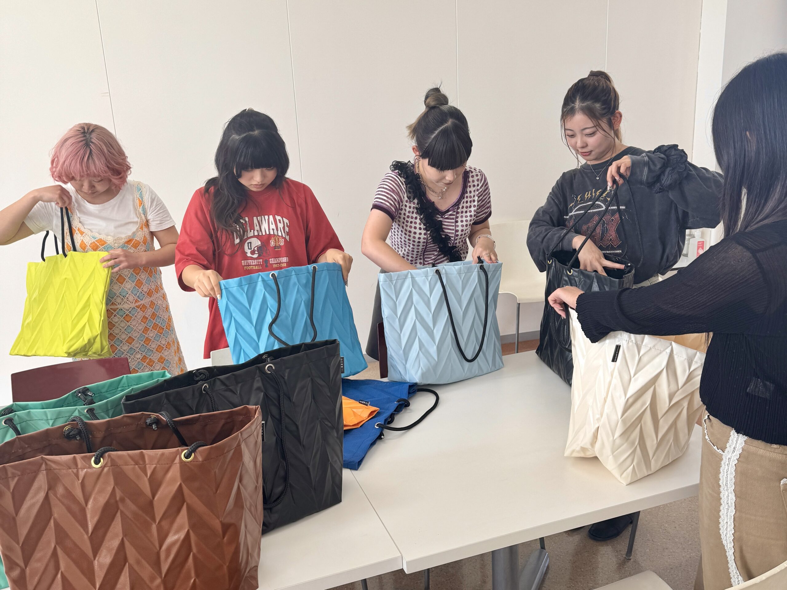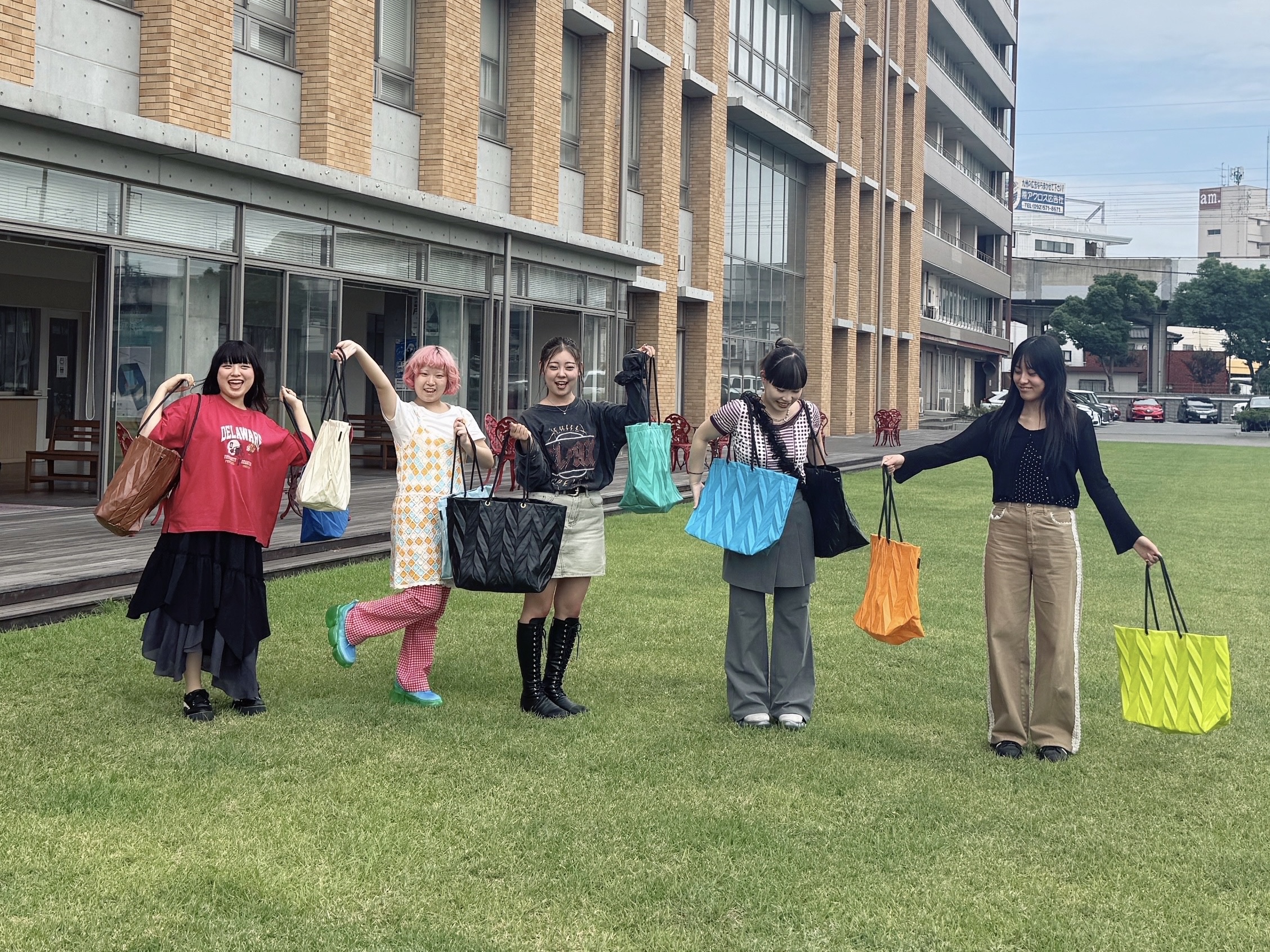 大型テントの製造過程で生じる膜材の端材を、バッグなどのファッションアイテムへと生まれ変わらせる新たな取り組みを共同で進めており、学生がデザインしたバッグがお披露目されました。